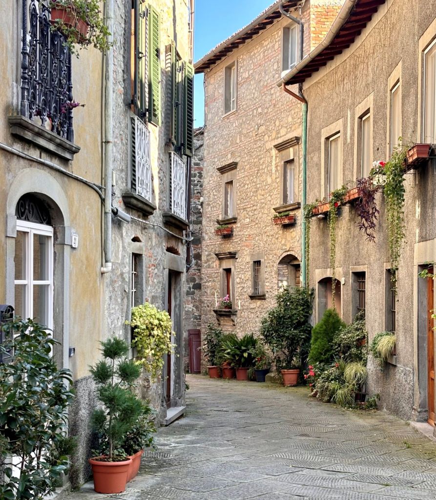 Venturing into Castiglione di Garfagnana was both lovely and eerie. It is a medieval walled fortress with roots dating back to the Romans. The fortifications are quintessential overlooking a beautiful valley. As we walked into the village, we left the parking lot behind and crossed into what seemed to be an abandoned village. Everything was lovely and cared for, and there were signs of life and occupancy, but we did not see another person until rather late in our visit! The eerie quiet solitude of the place made the exploration of it almost otherworldly. It was just the four of us and no jostling or avoiding others or waiting to get the best view possible. There’s a small park and garden near one of the medieval battlements that was dedicated to those from the village who had died in both World Wars. It was neatly trimmed and cared for and overlooked a remarkable swath of Tuscan landscape dotted with other charming buildings and structures reaching into the distance. Given the seeming small size of the village, the number of names seemed rather daunting.